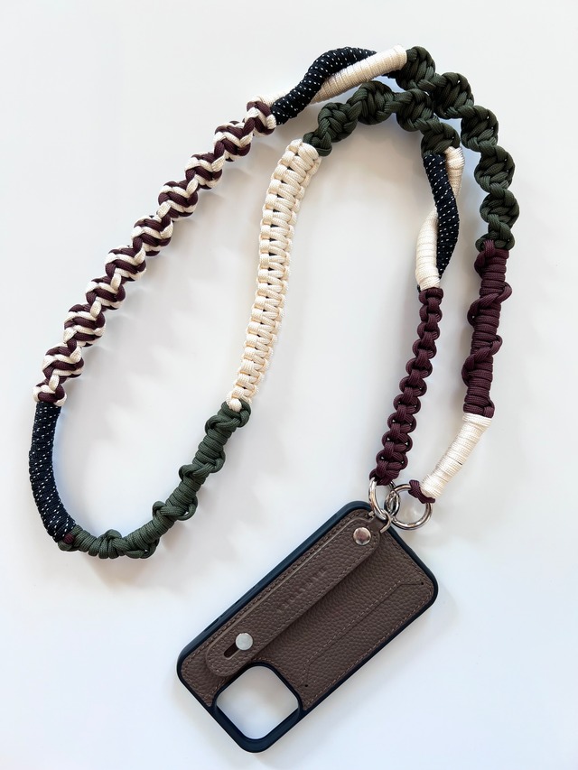 アウトドアの空気感をイメージしてデザインした、存在感のあるスマホショルダー。 複数の結びを組み合わせた、さりげなく個性を感じるデザインながらも、派手すぎず、日常にも自然に馴染むバランスに仕上げました。 男女問わず使えるユニセックスな雰囲気で、スタイルやシーンを選ばず活躍します。 スマホを「しまう」から「身につける」へ変えることで、必要な瞬間にすぐ手に取れる快適さを実現。 アウトドアやフェス、旅行や散歩など、動きの多いシーンでもスマホの置き場所に迷うことがなくなり、ストレスのない自由な行動をサポートします。 両手が空くことで、荷物を持つ・写真を撮る・自然の中で過ごす時間そのものに集中できるのも大きな魅力。 機能性とデザイン性を兼ね備えながら、日常にも非日常にも寄り添うアイテムです。 ♦︎長さ : 約130cm ・一つひとつ手作業で制作しているため、個体差も含めて個性としてお楽しみください。 ハンドメイドにご理解の上、ご購入ください。 ・結び終わりや色のつなぎめは極力小さくしていますが、焼き止めをしております。 不良品等ではございませんのでご了承お願いします。 (最後の画像参照) ・必ずshopping guideをご確認の上ご購入ください。 https://macramehika.theshop.jp/p/00001