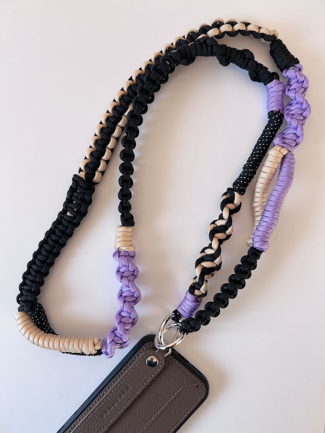 落ち着きのあるカラーに、パープルのポイントカラーが映えるストラップ。 コーディネートにさりげないアクセントをプラスします。 ♦︎ サイズ:約130cm