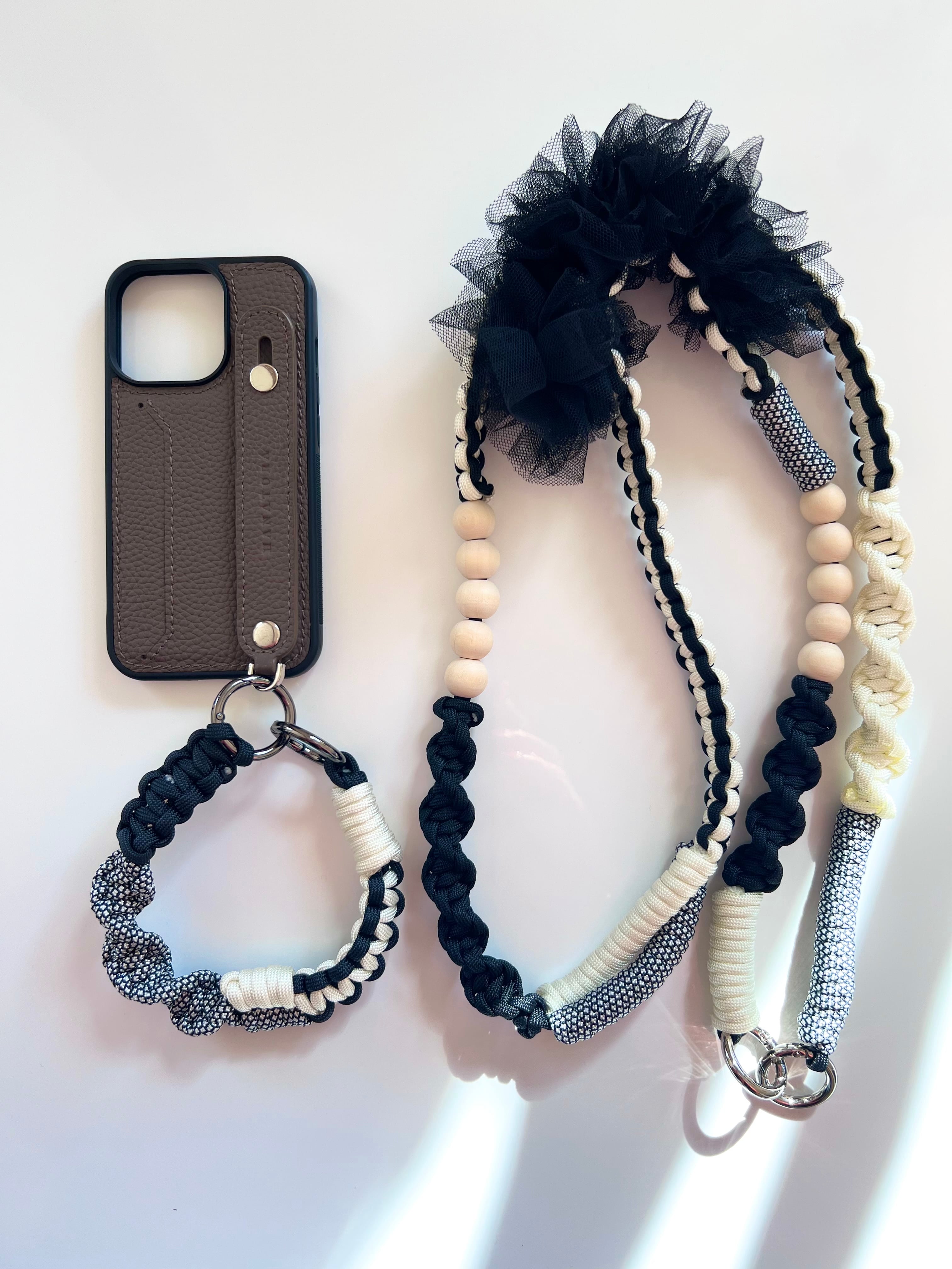 モノトーンの黒と白でシンプルかつスタイリッシュに仕上げたショルダーストラップです。