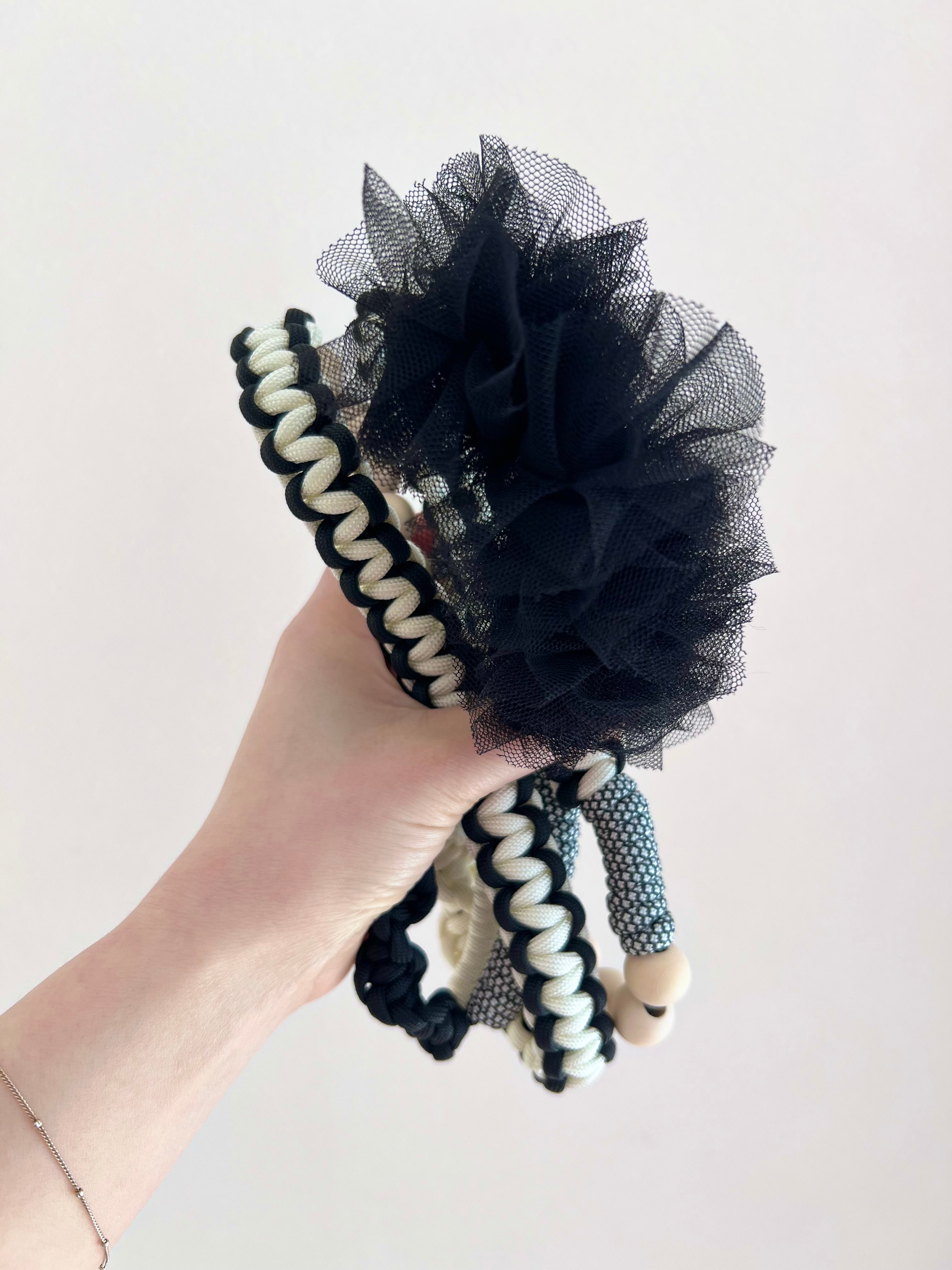ふんわり チュールリボン とナチュラルな ウッドビーズ の組み合わせが、シンプルながら個性的なアクセントに。