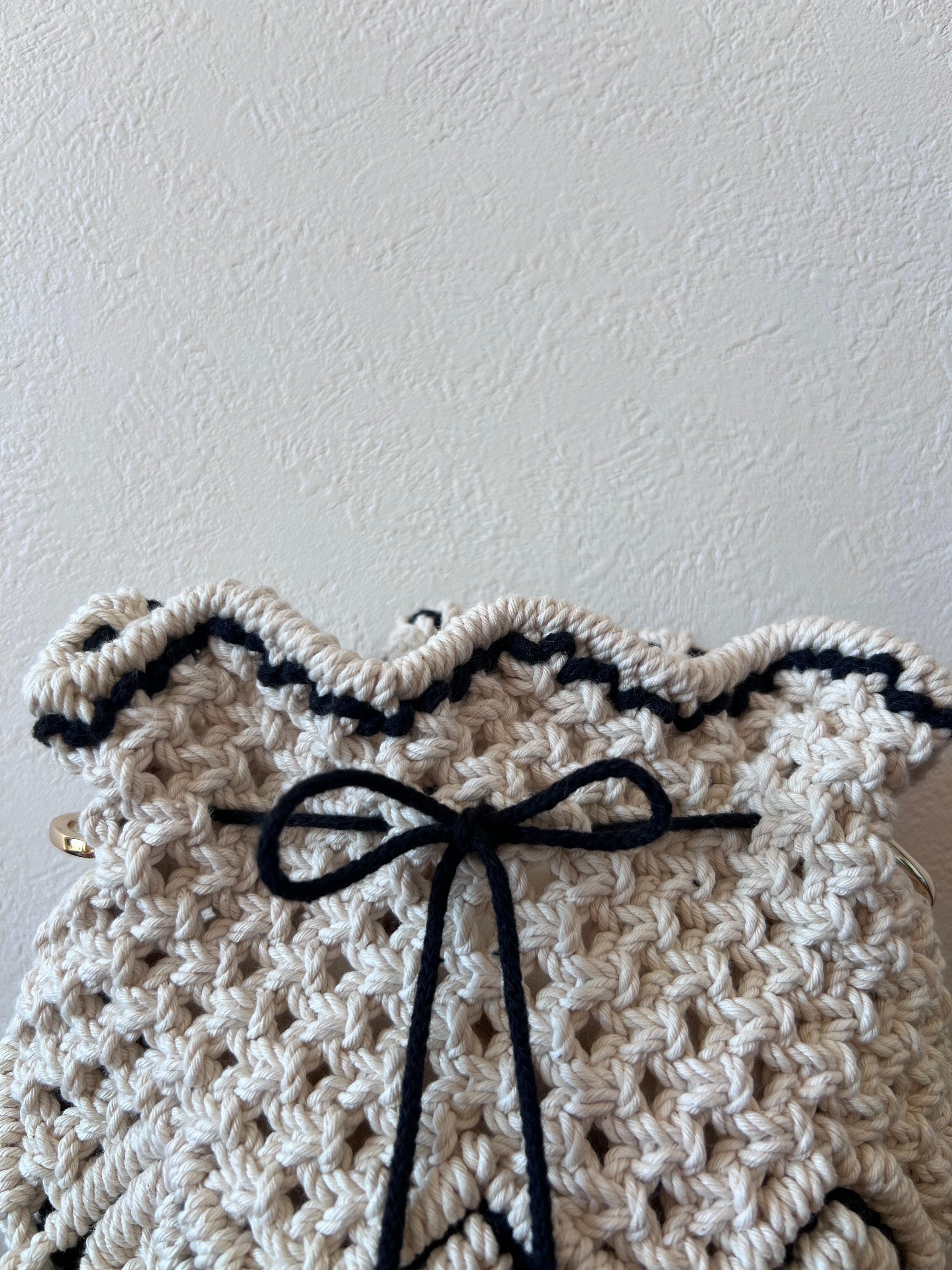 口部分のフリルとステッチがアクセントの、遊び心いっぱいの巾着バッグ。