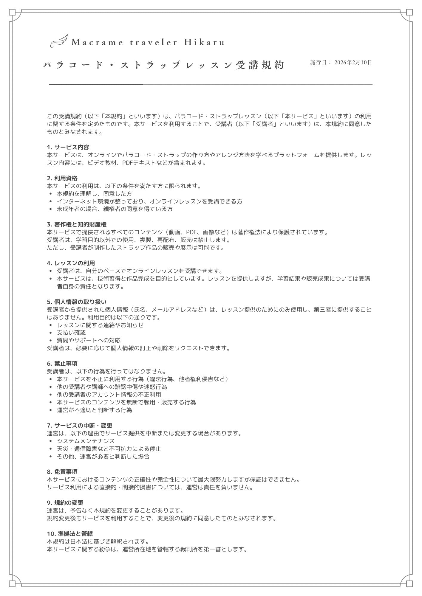パラコードレッスン受講規約 | Macrame traveler Hikaru